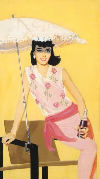 Brunette under parasol holding Pepsi-Cola.