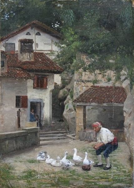 Peasant Man Feeding Geese in Village Street