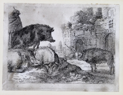| A 17th century engraving of a group of boar and swineherds within a courtyard, with city skyline in the background | |