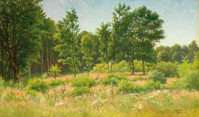 Blühende Lichtung vor Waldhintergrund.