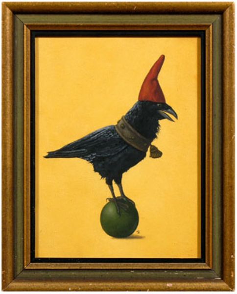 | black bird with red cap standing on a green ball | |