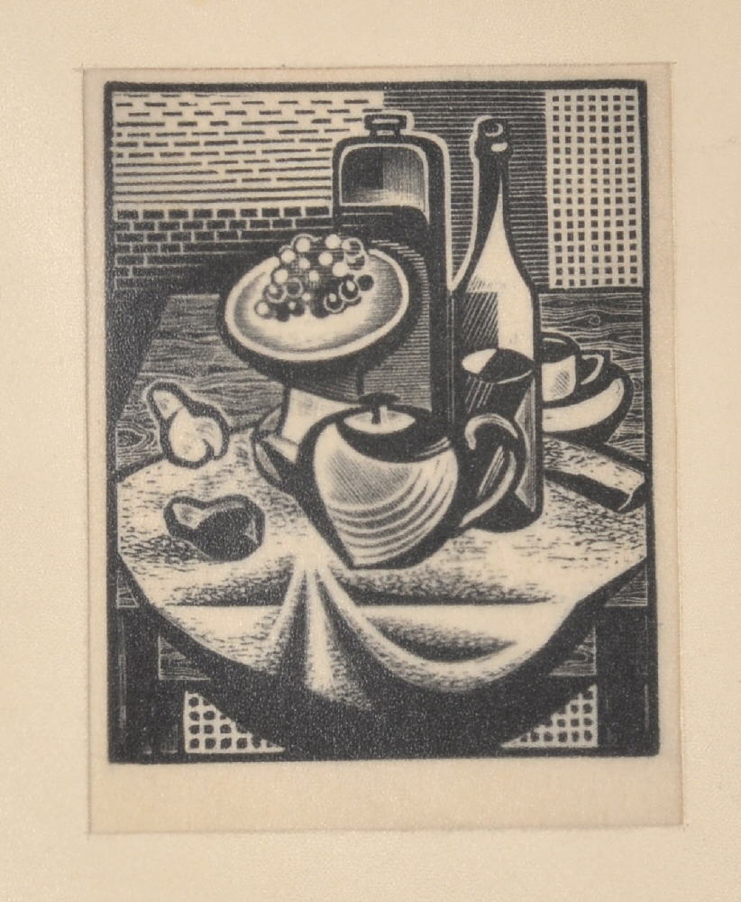 Stillleben mit Flasche, Kanne und Obstschale
