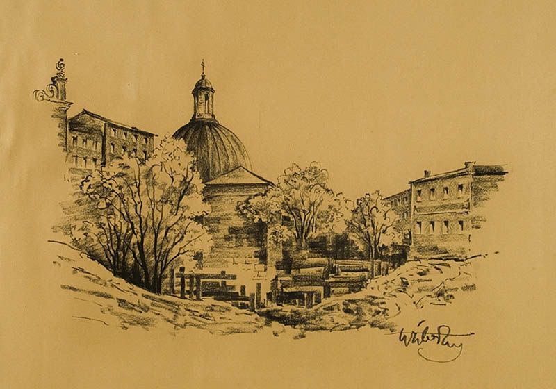 PEJZAŻ MIEJSKI Z KOPUŁĄ KOŚCIOŁA
