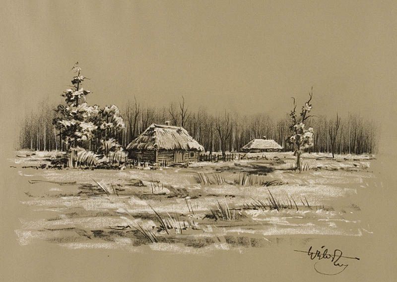 PEJZAŻ ZIMOWY Z DWIEMA CHATAMI