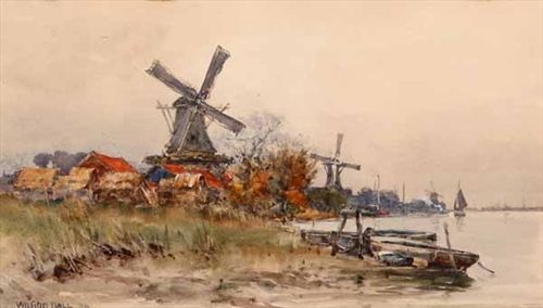 DUTCH SCENE WITH WINDMILLS AND BOATS