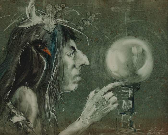 Wahrsagerin mit Rabe und Glaskugel