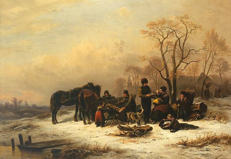 | Winterlandschaft mit Holzsammlern, Pferden und Schlitten vor Kirchdorf im Hintergrund | |