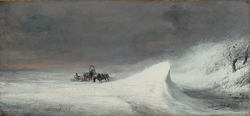 Bauer mit zweispännigemPferdeschlitten in weiter verschneiter Landschaft