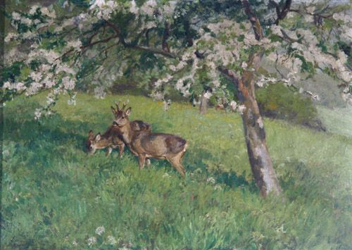 | In blühender Wiese, Rehwild in sonnendurchfluteter Landschaft | |