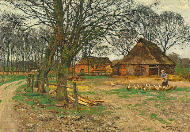 Reetgedecktes Anwesen mit Hühnerhof und Bäuerin in herbstlicher Landschaft