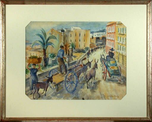 Gasse in einer südländischen Stadt mit reicher Figurenstaffage und Eselskarren