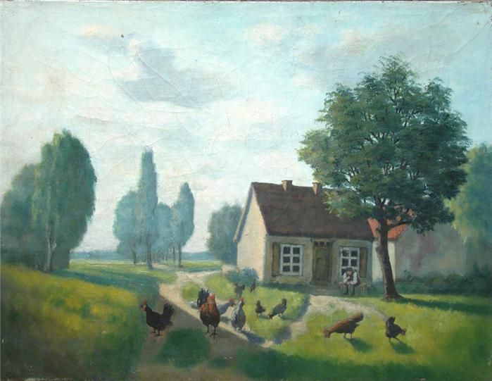 Sommerlandschaft mit Hühnern vor Gehöft.