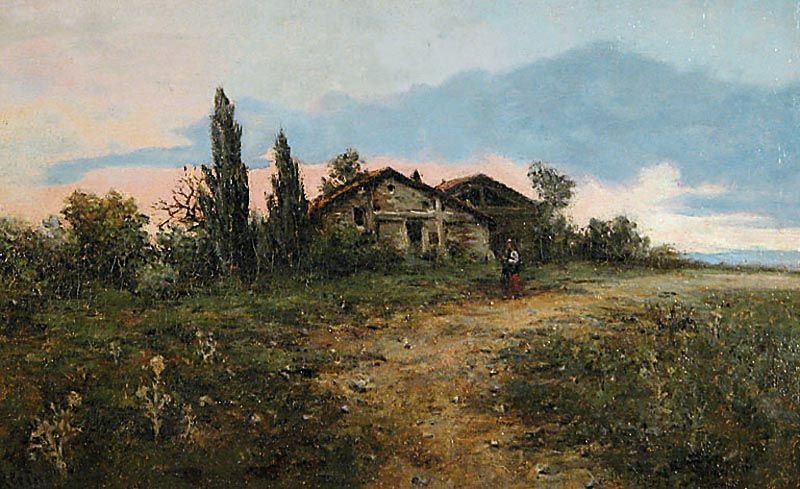 | Landschaftsdartellung in der Dämmerung, mit Hütten und Personenstaffage | |