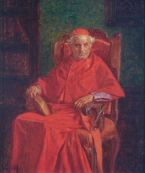 In einem Intérieur sitzt auf einem Sessel ein Kardinal, in seiner Rechten ein Buch