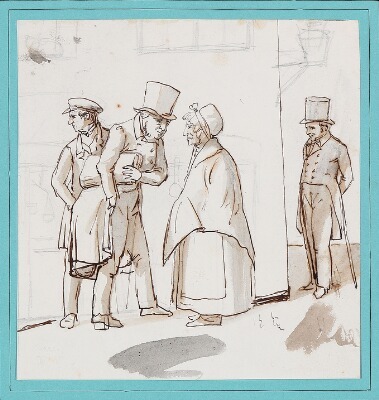 A street corner conversation. Unsigned. Drawing ink and pencil on paper. 184×159 mm. | |