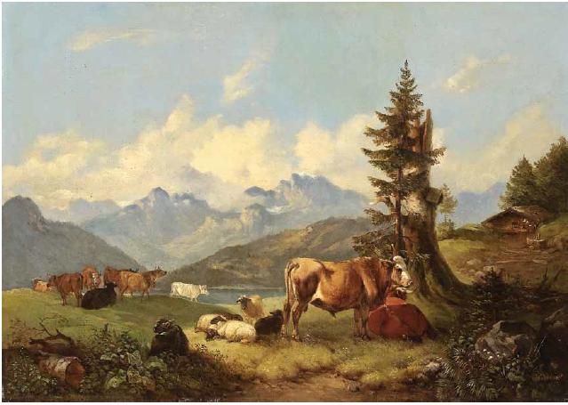 Alm mit Weidevieh vor Gebirgslandschaft.
