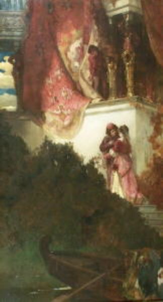 | Das belauschte Rendezvous. Vor einer Renaissancearchitektur steht ein junges Paar, welches von einem Mann belauscht wird, der hi | |