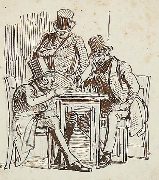 Three gentlemen playing chess
