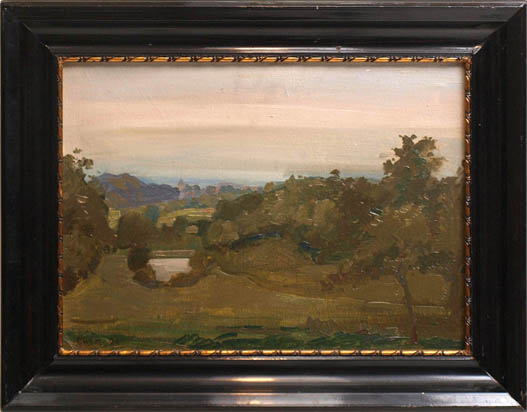 Weite Voralpenlandschaft mit kleinem Dorf im Licht der untergehenden Sonne