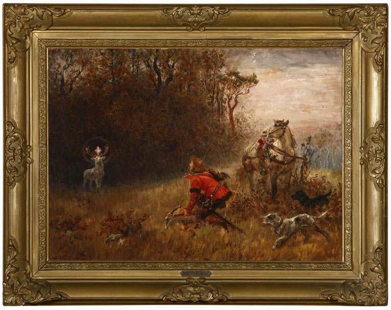 | Hubert at the scene of his conversion to Christianity kneeling before a white stag with a crucifix between its antlers | |
