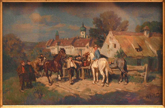 Bauern beim Pferdehandel. Im Hintergrund Häuser und Kirche einer kleinen, barocken Stadt unter sommerlichem Himmel