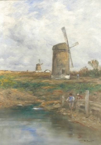 Kvarnrad, i förgrunden fiskande pojkar. Motiv från Holland.