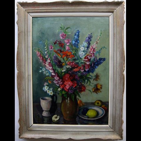 STILL LIFE, SPRING FLOWERS IN JUG WITH FRUIT AND CUP
