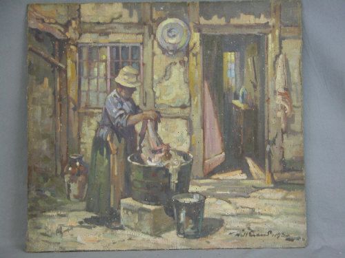 Woman washing outside cottage