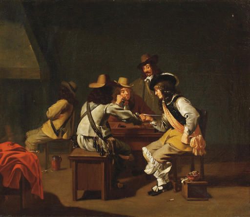A guardroom interior with soldiers playing a boardgame