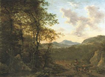 | An Italianate wooded landscape with a peasant on his mule driving sheep on a track, a river and mountains beyond | |
