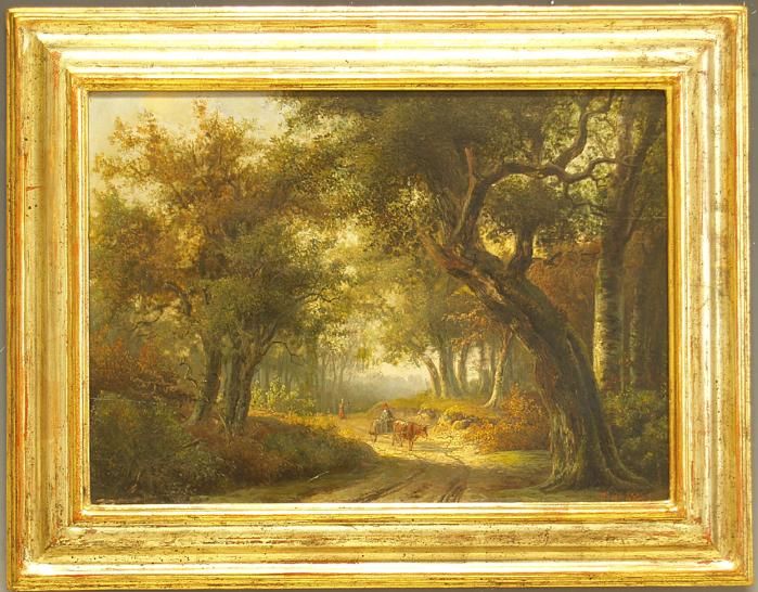 Sommerlicher Waldweg mit Personen und Bauer mit Ochsengespann