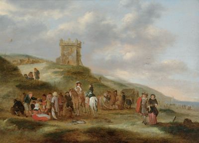 | Dutch coastal landscape with a fishmonger, two horsemen, and an elegant couple | |