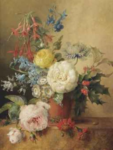 | A fuchsia, roses, chrysantheum, holly and other flowers in a terra cotta vase, on a marble ledge | |