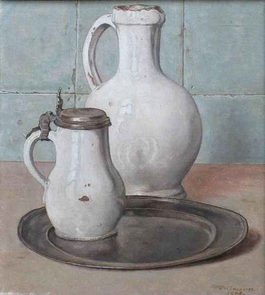 Stilleven met Delfts witte kannen.
