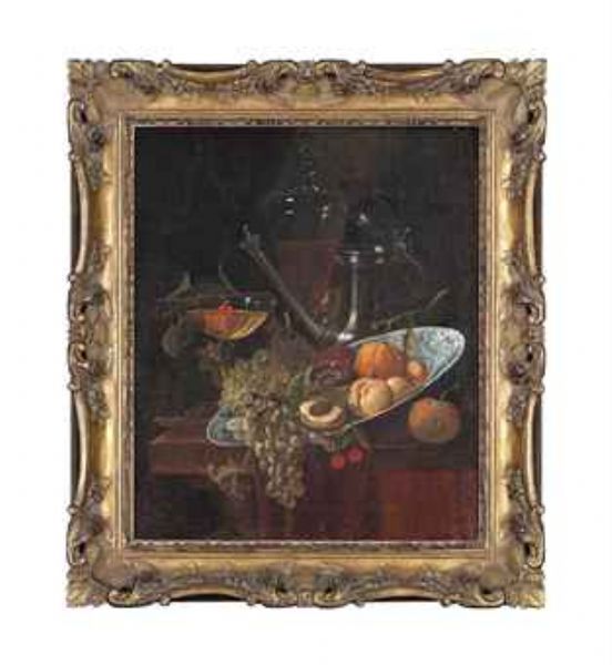 | Pomegranate, oranges, peaches, grapes, cherries, a walnut with a pewter ewer, a kraak dish, a glass carafe and a wine glass on a | |