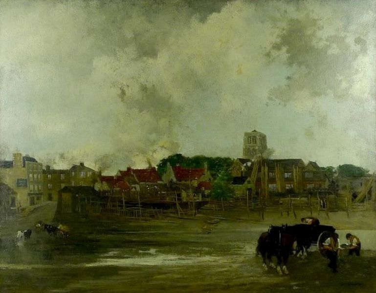 | a study of cockle pickers in the Rye bay, with shire horses and carts working on the shoreline | |