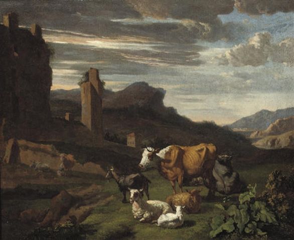 A wooded landscape with cattle and sheep