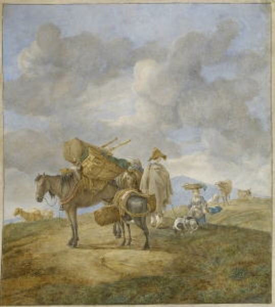 Hirtenpaar mit bepackten Pferden, einem Esel und Vieh