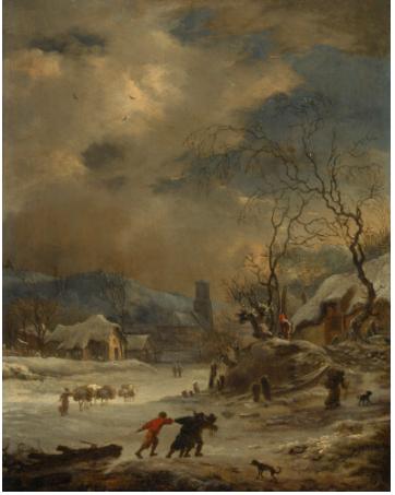 | A WINTER LANDSCAPE WITH TRAVELLERS AND FIGURES GATHERING LOGS ON A FROZEN RIVER NEAR A VILLAGE | |