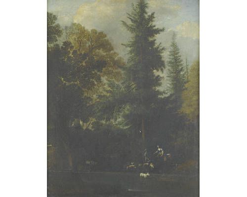 Peasants watering their cattle in a wooden landscape