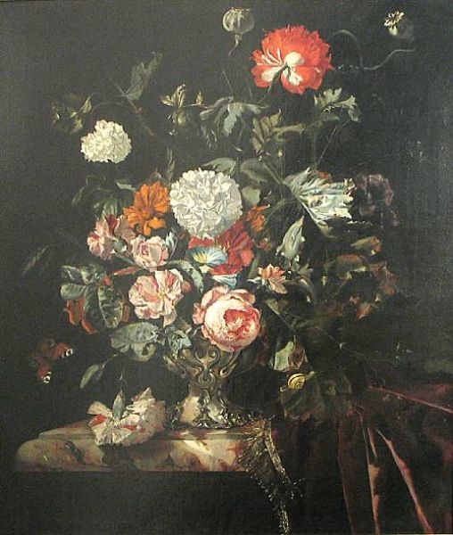 A still life with roses, poppies and other flowers in a silver vase