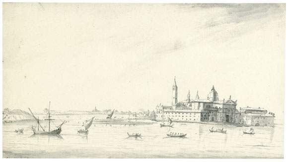 | Barques et bateaux sur la lagune au pied de l'église Saint Georges le Majeur à Venise | |