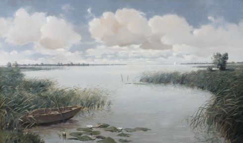 Gezicht op een vissersboot in het riet gelegen