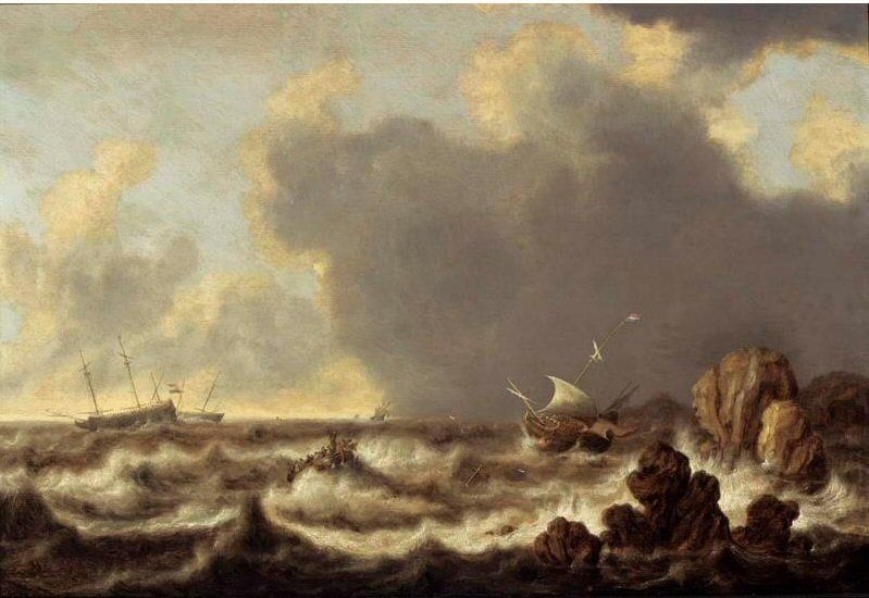 | SHIPS AT ANCHOR, A SAILING BOAT AND A ROWING BOAT IN STORMY WATERS | |