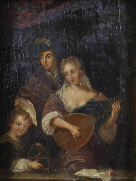 A lady playing a lute, gentleman and boy with caged bird, by a window