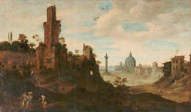| An extensive landscape with elegant figures passing a beggar on a track, ruins nearby and a 'capriccio' view of Rome in the dist | |