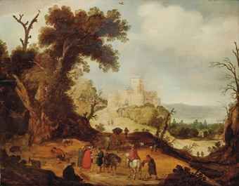 | An Italianate landscape with travellers and a fortune teller on a path, a fortification beyond | |
