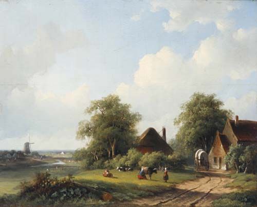 | Weite niederländische Landschaft, im Vordergrund ein Gehöft mit melkenden Bäuerinnen | |