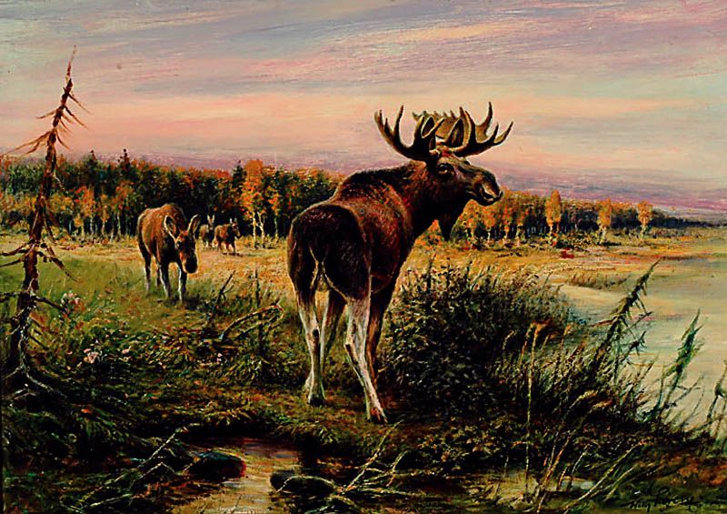 Elche auf einer Lichtung in nordischer Landschaft