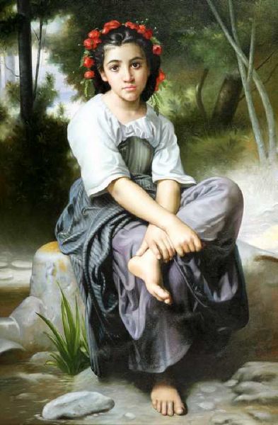 A Young Peasant Girl with flora tiara resting by a stream at the edge of a Wood